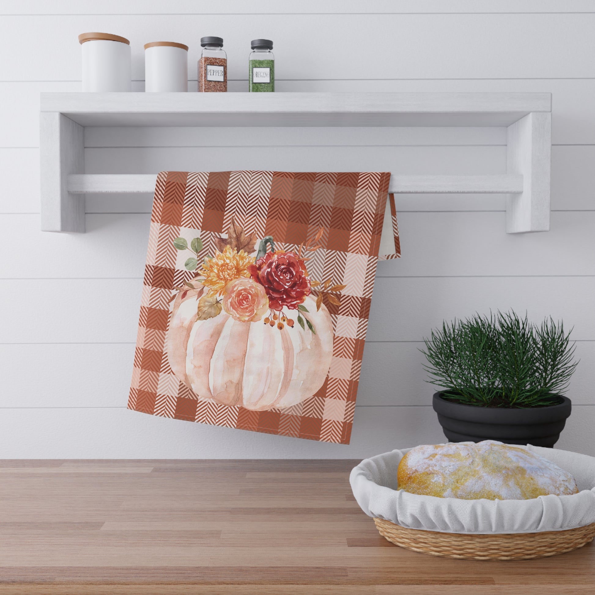 Give an extra boost to your Fall Decor in your kitchen with this vibrant Cottage Fall Plaid Pumpkin Tea Towel! With a stunning one-sided print for practical everyday use in your kitchen!